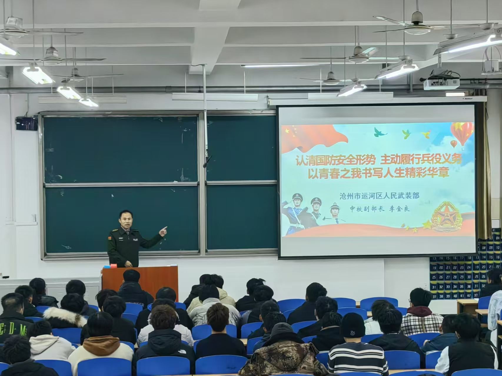 为深入贯彻落实习近平强军思想,宣传国家征兵政策,激发青年大学生参军入伍热情,推动我校大学生征兵工作提质增效,12月12日,我校联合运河区人民武装部,举办了2025年春季征兵政策宣讲会。本次活动由运河区人民武装部副部长李金良进行政策宣讲,我校人民武装部郭健老师主持宣讲会。活动伊始,与会人员共同观看了学校征兵宣传片。随后,李金良为同学们详细介绍了国家征兵政策、军队建设成就以及军人职业发展的广阔前景。他结合自身经历,...