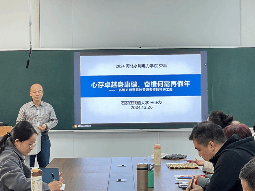 为转变教师科研观念,拓展学术视野,助力科研能力提升,12月26日下午,计算机系在高新区产教融合示范园区7A310开展了主题为“心存卓越身康健,奋楫何需再假年”的学术讲座。本次讲座邀请到石家庄铁道大学王正友教授主讲,石家庄学院教师陈枫,计算机系副主任冯涛、王建文及全体教职工参加会议。讲座伊始,王正友分享了个人求学和工作经历,并介绍了其丰硕的科研成果,涵盖国家级、省部级纵向项目,以及众多横向项目和论文专利。他以大学教师的主要职责为出发点,...