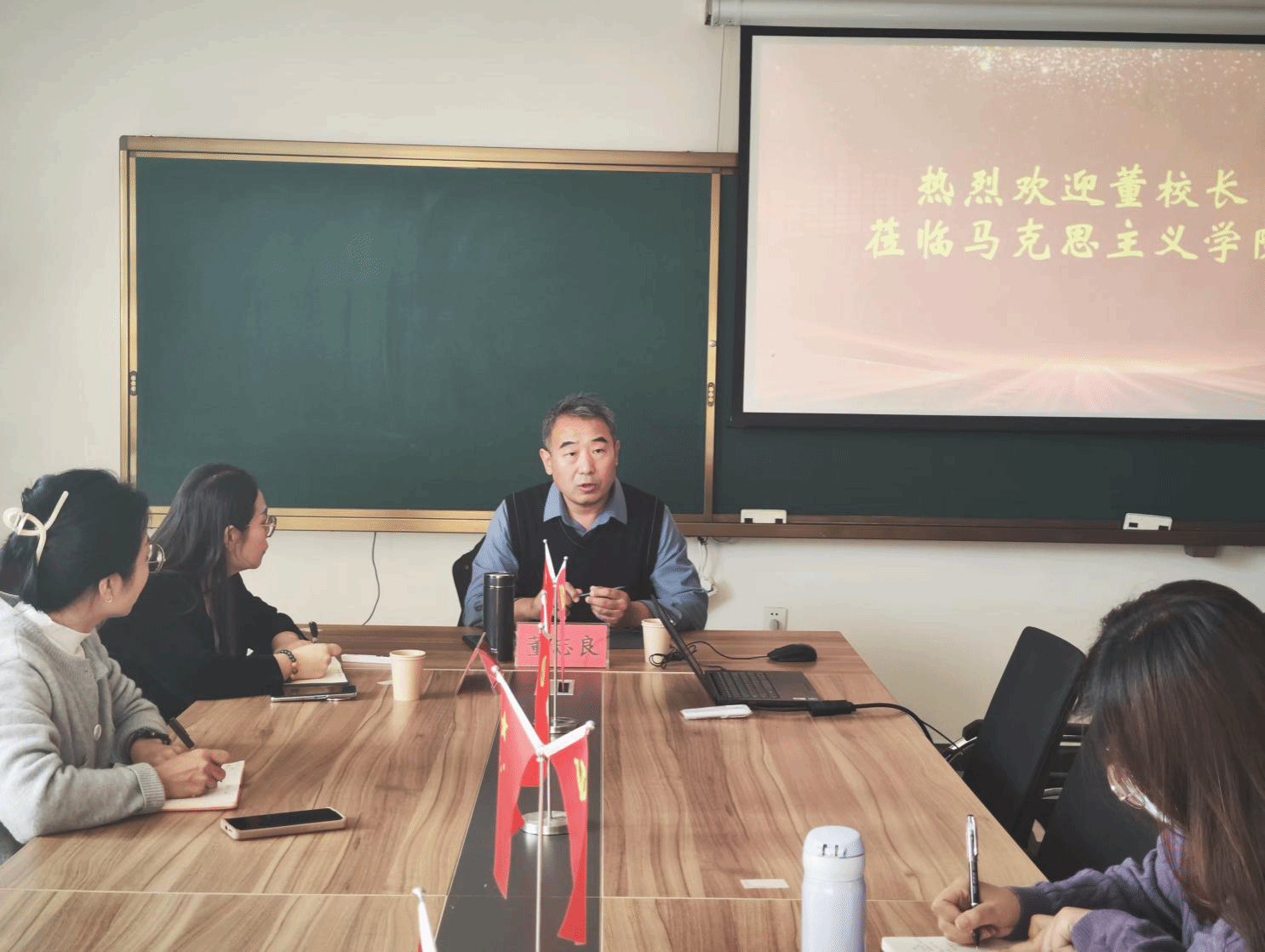 贾启红从基本概况、特色举措和对未来发展的展望三个方面进行了汇报,董志良认真听取了汇报,并对马克思主义学院在过去三年中的建设成果尤其是青年教师的培养、教育教学改革等工作的扎实推进表示肯定。