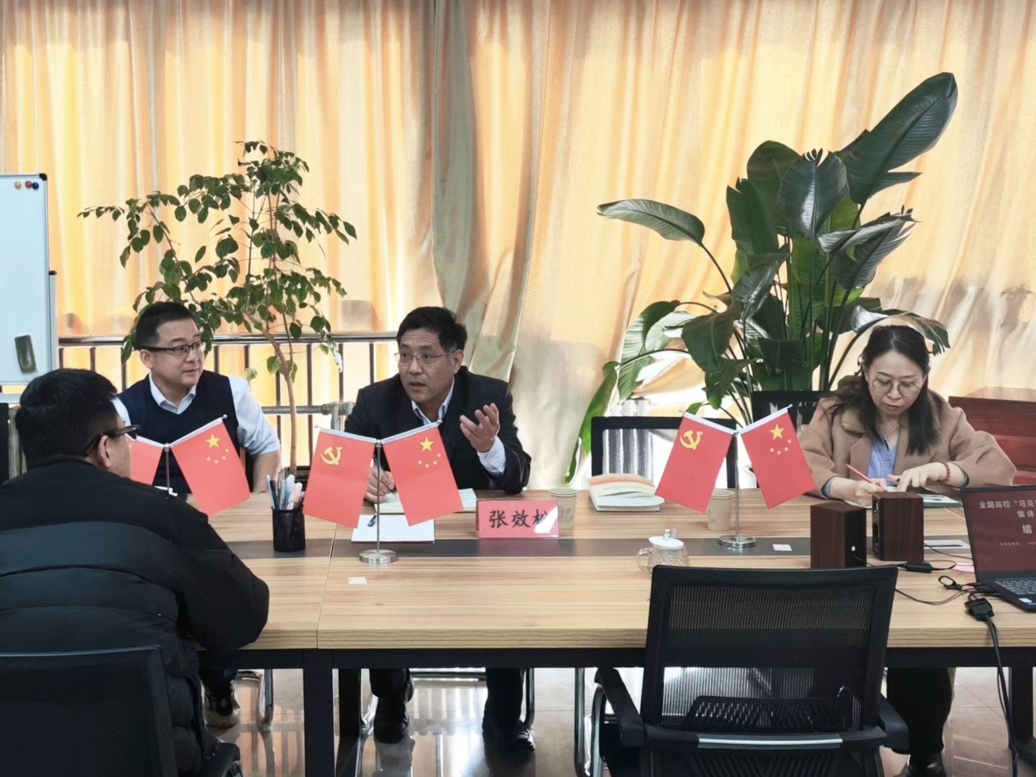 张效松首先察看了马克思主义学院的办公设施及图书资料室等场所,了解了新学期安全、消防等工作落实情况。在随后召开的办公会议上,贾启红就马克思主义学院如何贯彻落实党的二十届三中全会精神和习近平总书记系列重要指示批示精神,服务学校“大思政课”建设、教学科研工作开展、实践教学开展等情况进行了汇报。张效松对马克思主义学院各项建设成效给予肯定,对发展思路与工作举措表示赞同,他表示,各位思政教师在学校教育教学工作中充分发挥了马克思主义理论学科引领作用,实现了思政课建设的持续提质增效,弘扬了立德树人、培根铸魂的光荣使命。
