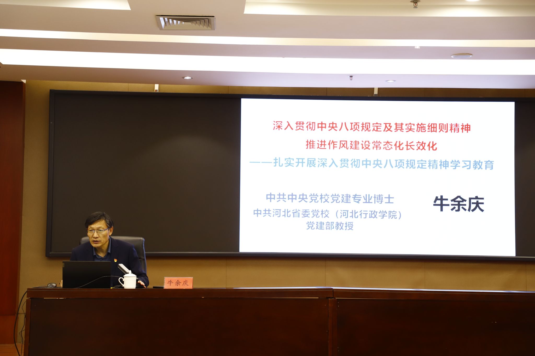 开班式后,牛余庆教授以“深入贯彻中央八项规定及其实施细则精神,推进作风建设常态化长效化——扎实开展深入贯彻中央八项规定精神学习教育”为题作辅导报告,报告从做好理论武装—认真学习领会习近平总书记关于加强党的作风建设的重要论述;防范重点问题—深入查找贯彻中央八项规定及其实施细则精神方面存在的问题;明确实践要求—一体推进学查改扎实开展学习教育三个方面进行了系统讲解。报告主旨清晰、层次分明、资料翔实,对准确领会和深入贯彻中央八项规定精神具有重要的指导意义。