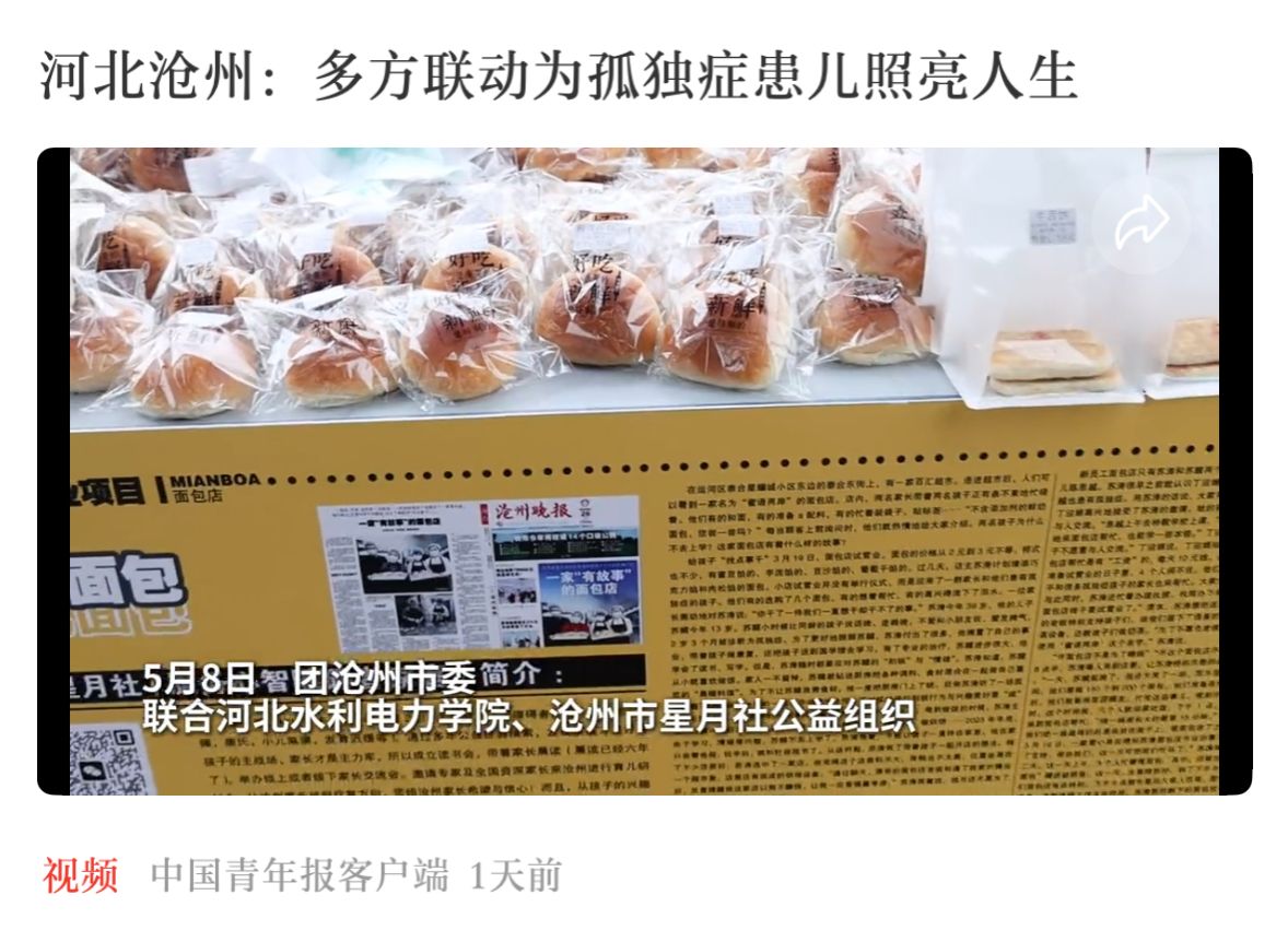 5月8日下午,共青团沧州市委联合我校团委、沧州市孤独症患儿家庭关爱团队星月社共同在我校第一食堂门口举办面包义卖活动。5月17日,中国青年报客户端报道了本次主题义卖活动,5月20日,《中国青年报》第二版以《河北沧州多方联动 为孤独症患儿照亮人生》为题对此次活动进行专题报道,有效提升了我校在公益领域的社会美誉度。