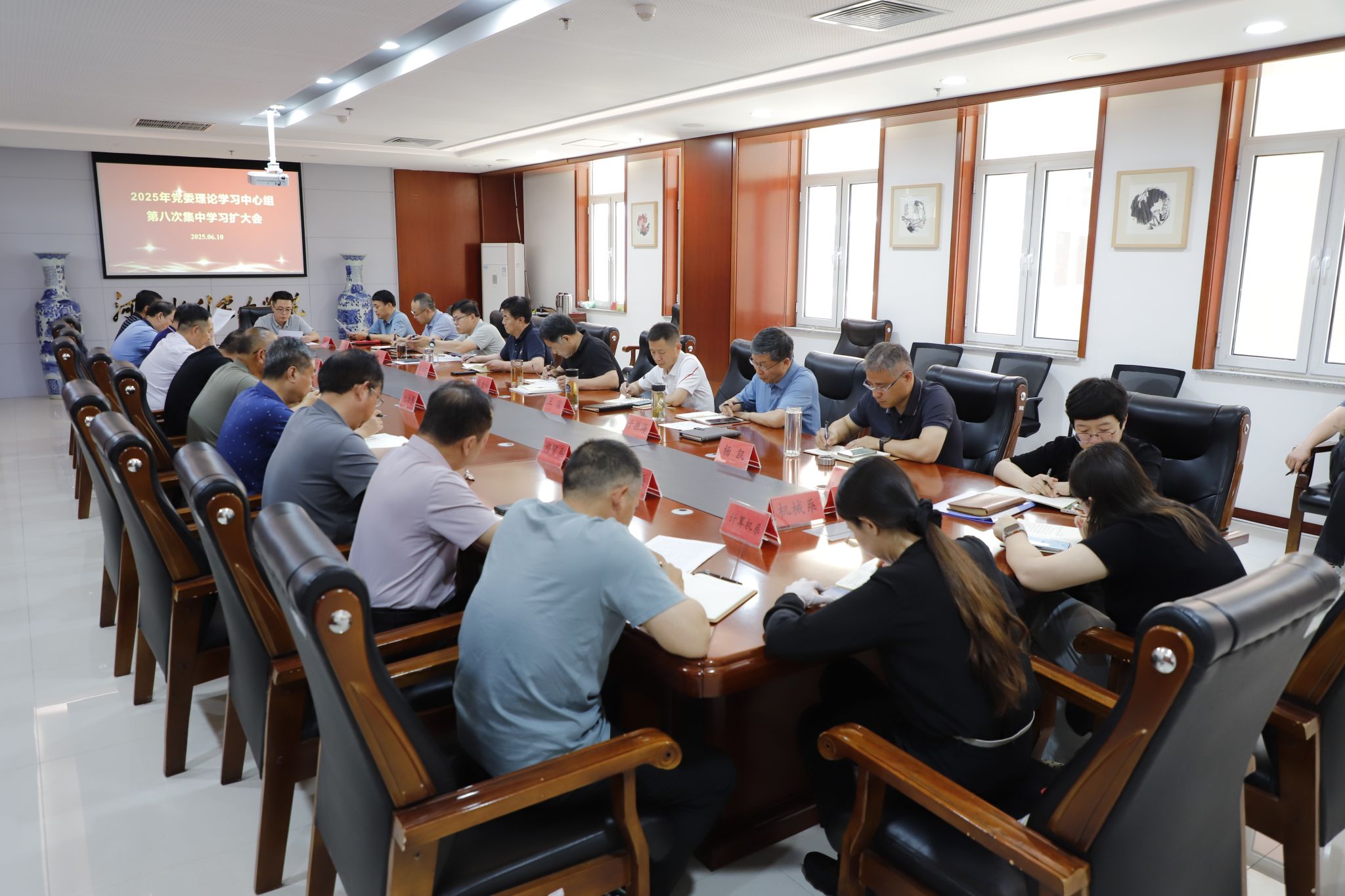 6月10日下午,我校召开2025年党委理论学习中心组第八次集中学习扩大会,认真学习习近平总书记在河南考察时的重要讲话、《党政机关厉行节约反对浪费条例》等内容。校领导班子成员出席会议,党委书记张效松主持会议并讲话。