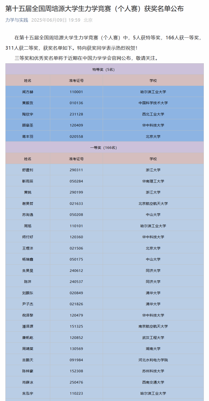 近日,第十五届全国周培源大学生力学竞赛结果正式揭晓。我校学子表现卓越,首次摘得全国一等奖桂冠,取得历史性突破,彰显了学校基础力学教学的扎实功底,呈现了我校学生创新实践教育的硕果。