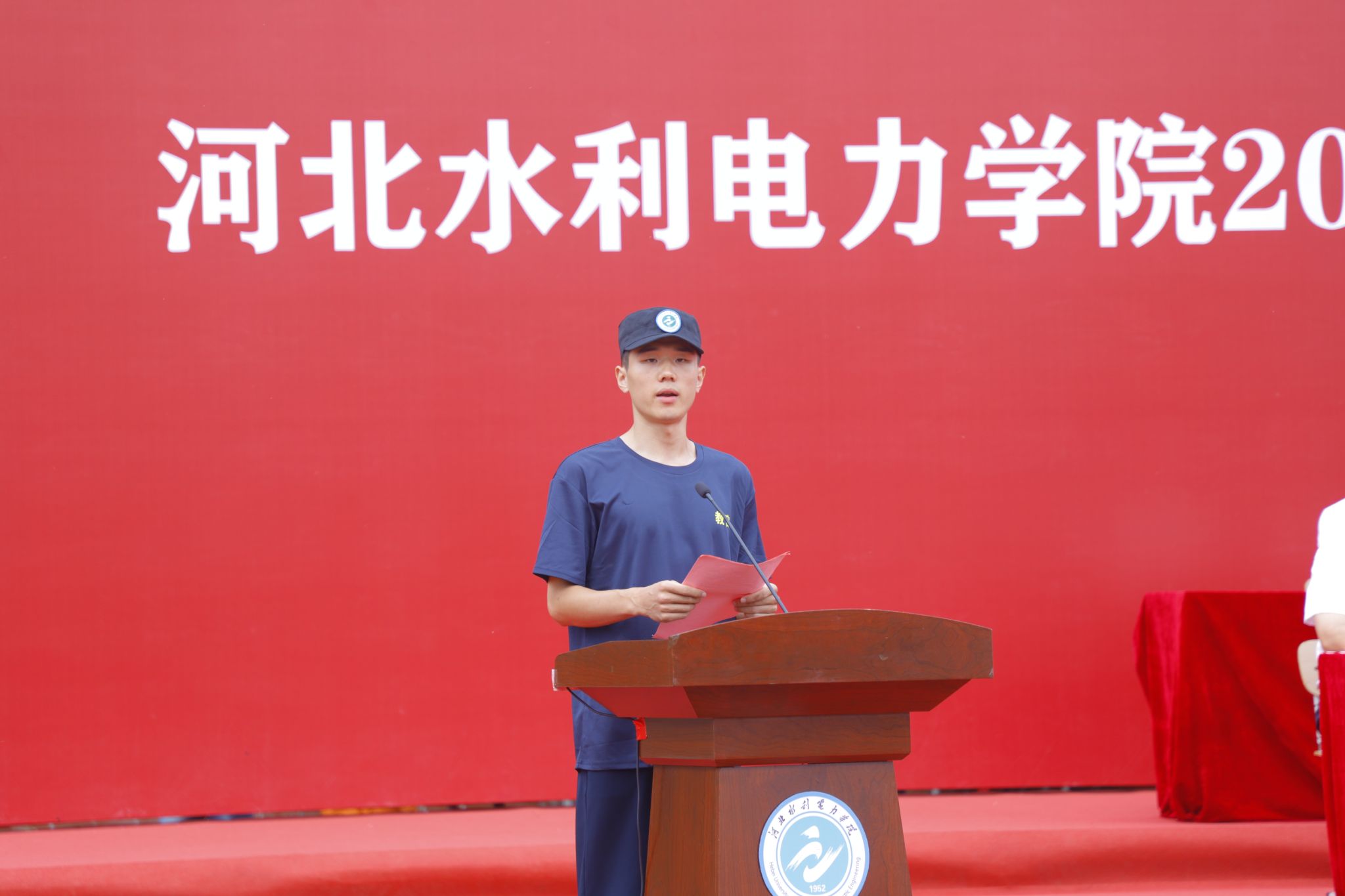 军训教官代表水利工程系水利水电工程202206班孔嘉硕代表全体教官作表态发言,表示必将高标准完成2025级新生军训任务。