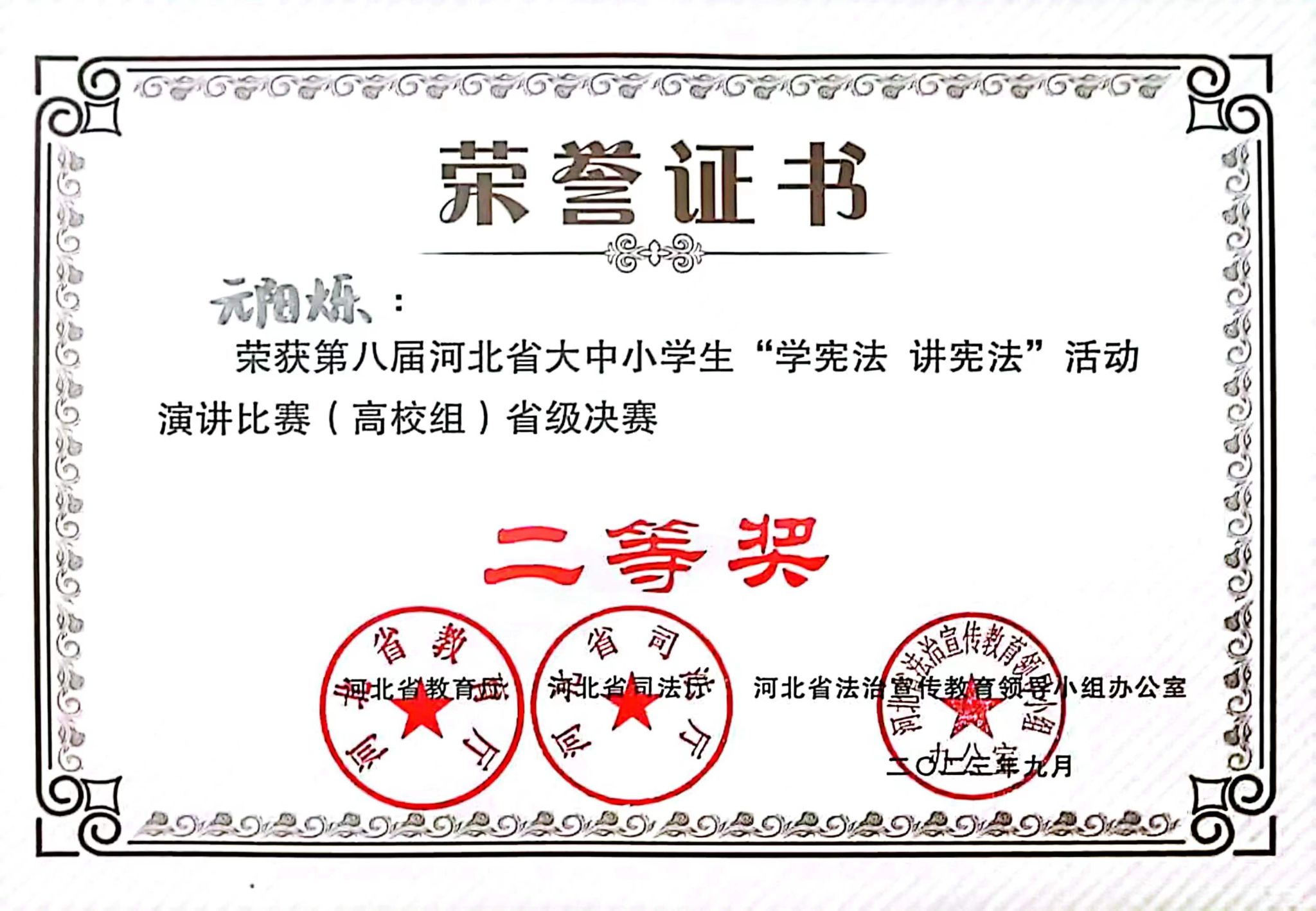 92627日,由省教育厅、省司法厅、省法治宣传教育领导小组办公室主办、河北师范大学承办的第届河北省学生“学宪法 讲宪法”大赛暨全国选拔赛在石家庄举行我校电气自动化系元阳烁和计算机系王近锟两位同学分别荣获“河北省大中小学生(大学组)演讲比赛省级决赛二等奖”“河北省大中小学生(大学组)素养竞赛省级决赛二等奖