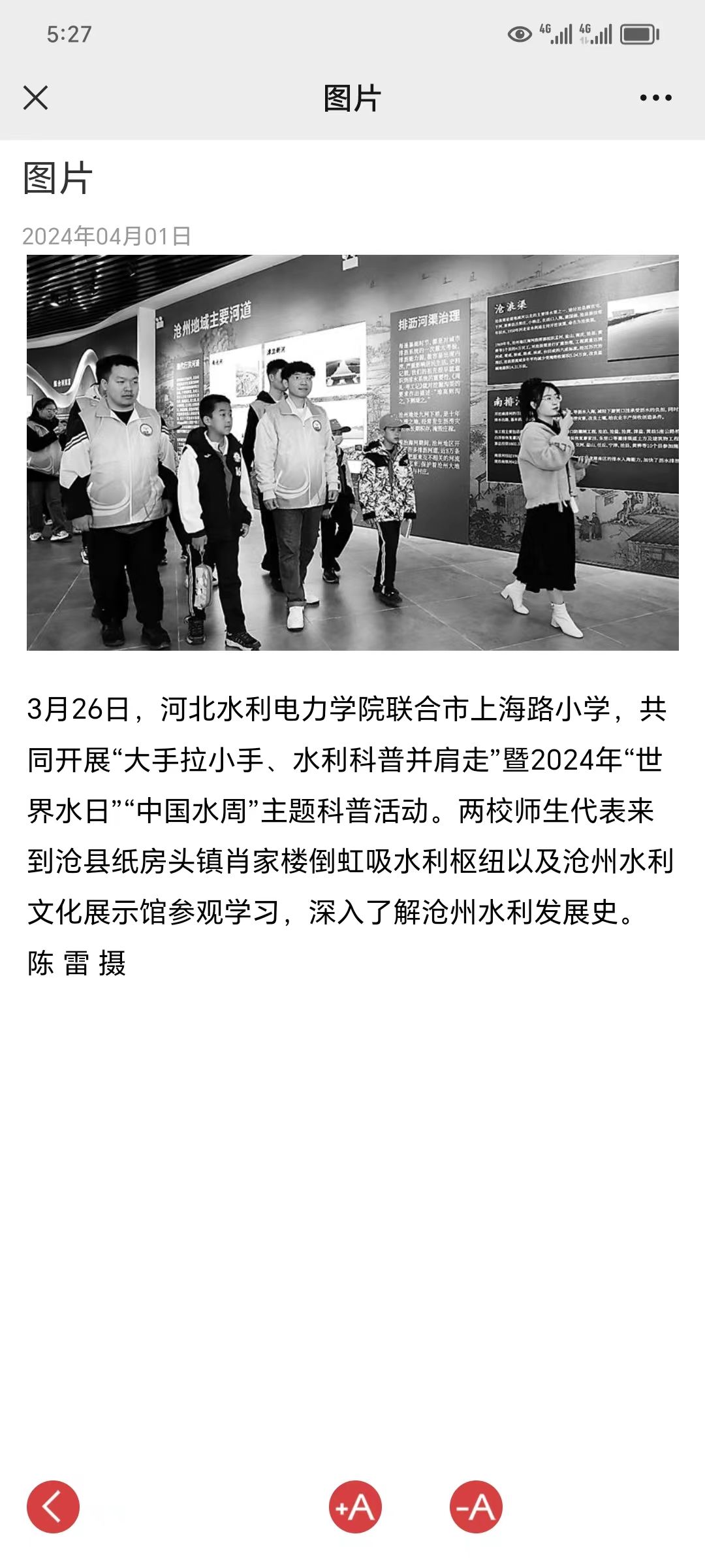 “沧州日报”报道我校“大手拉小手、水利科普并肩走”暨2024年“世界水日”“中国水周”主题科普活动