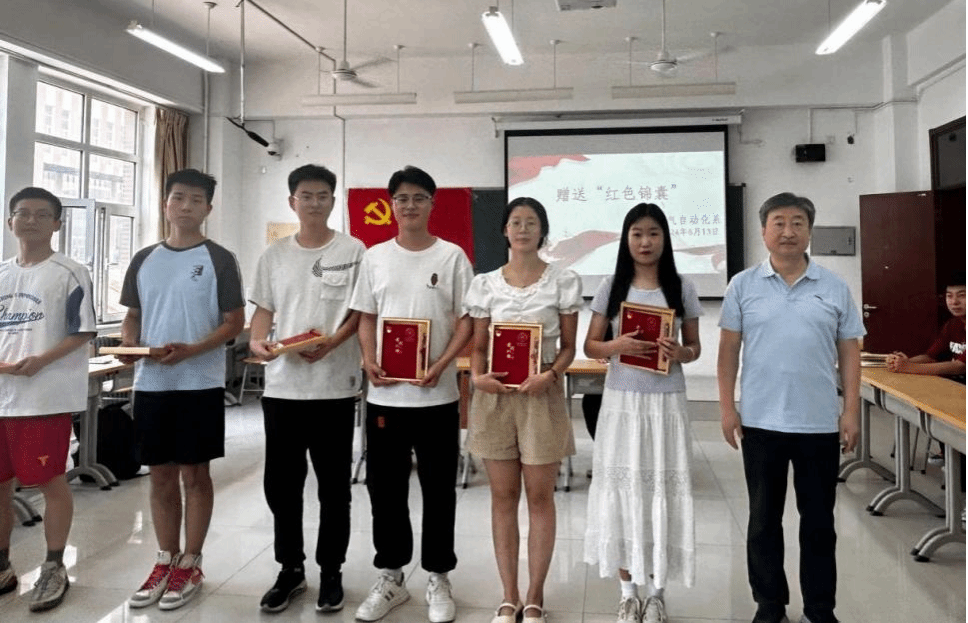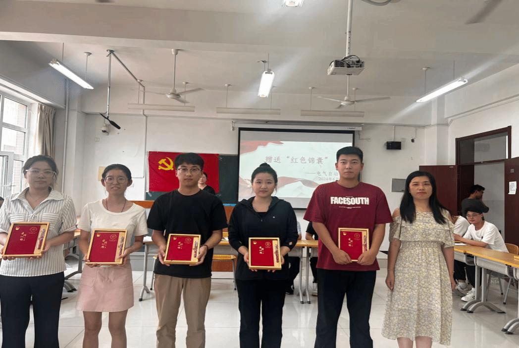 接下来,电气自动化系学生党支部为全体毕业生党员举行集体“政治生日”,老师们分别向学生代表赠送了装有党徽、钢笔和笔记本等物品的“红色锦囊”,并合影留念,以此表达对毕业生党员的殷切期望和美好祝愿。