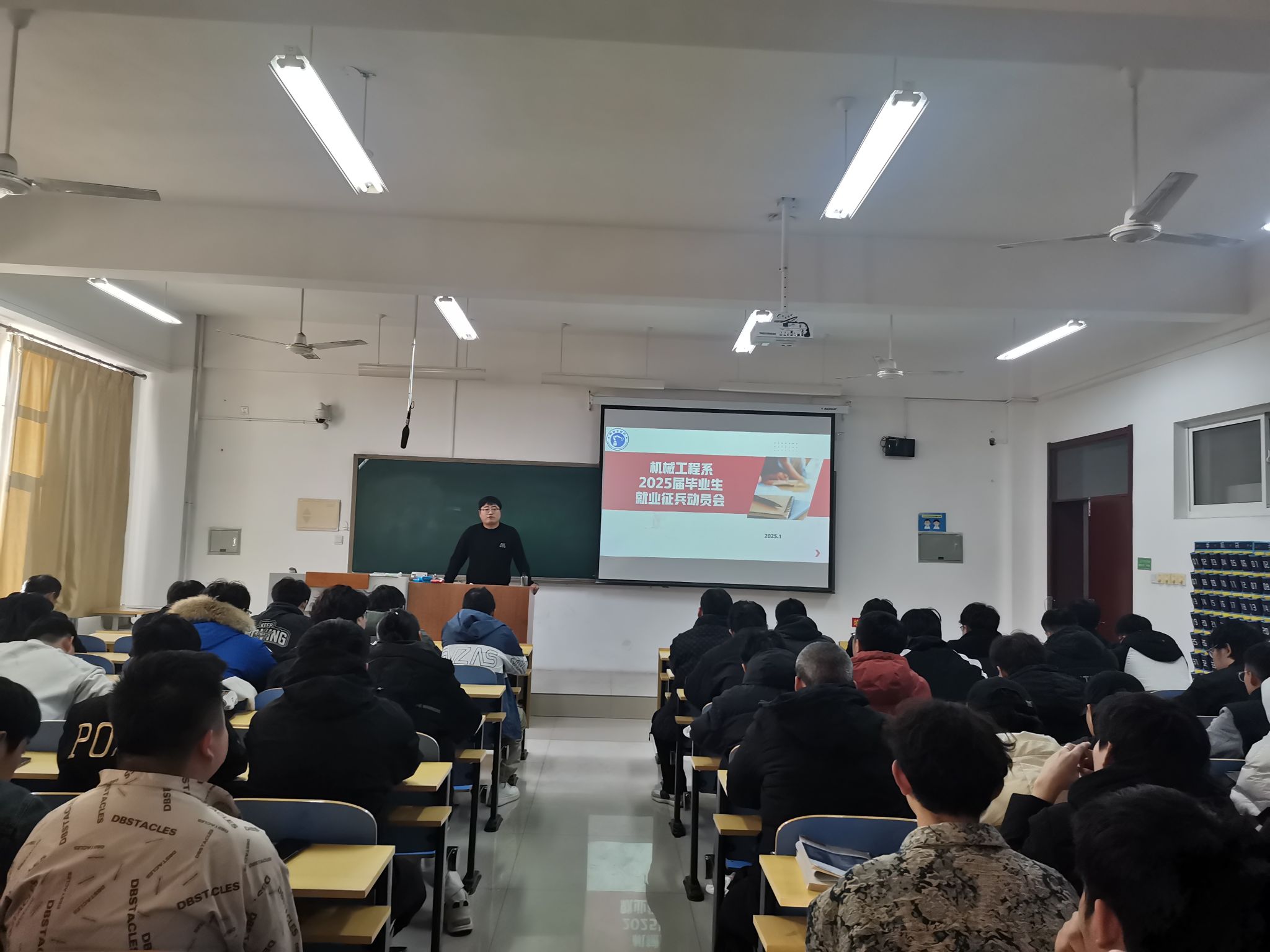1月7日,机械工程系在创新楼B409召开2025届毕业生征兵就业再动员会议。此次会议旨在积极响应党和国家的号召,推动征兵政策的深入宣传,引导毕业生高质量就业。会议由系就业联系人张晓雨主持,系党委副书记杨学智担任主讲,2025届全体未就业毕业生参加。