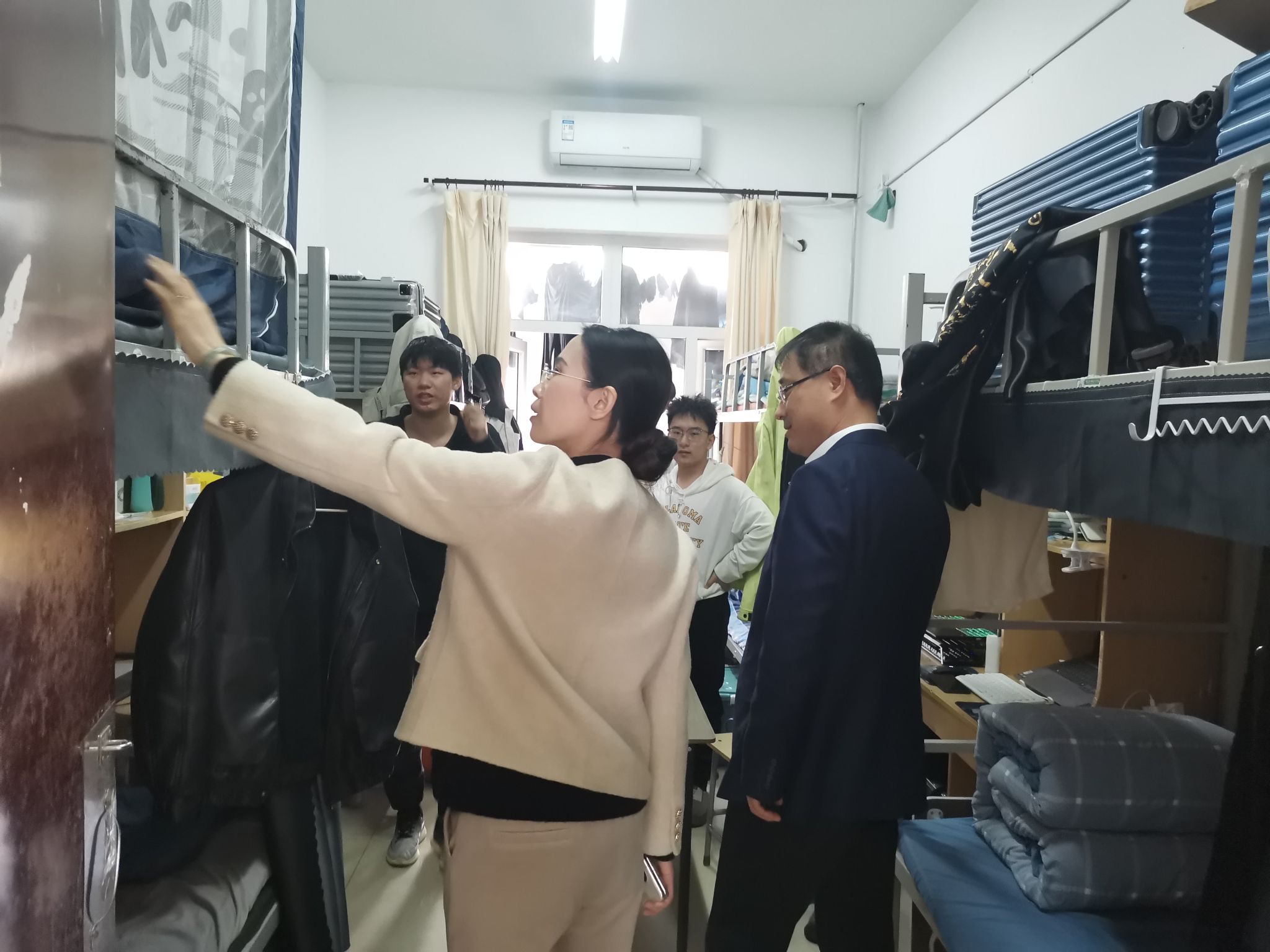 检查过程中,杨凯逐一走访各个宿舍,与同学们展开了亲切而深入的交谈,关心同学们在生活和学习中遇到的问题。对于大四学生,杨凯特别询问了他们的就业和考研情况,勉励同学们要紧跟时代发展步伐,以积极乐观的心态去创造属于自己的美好未来。他鼓励同学们提前做好未来规划,养成良好生活习惯,携手营造健康向上、温馨和谐的寝室氛围。