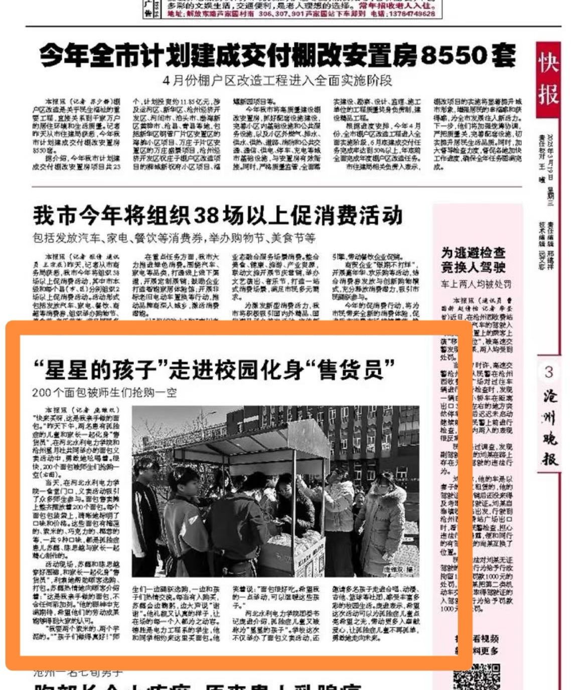 为进一步扎实做好河北共青团“小橘灯”助残接力计划,在关心帮助残障儿童等弱势群体方面发挥有效作用,深入推进“小橘灯”助残接力计划社会化、规范化、品牌化、专业化、常态化开展,3月18日下午,共青团沧州市委、共青团乐动平台委员会联合星月社、蜜语两岸面包店在学校第一食堂门口开展“微光照亮人生,烘焙传递温暖”主题义卖活动,沧州电视台和《沧州晚报》分别对本次活动进行了网络直播和报道。