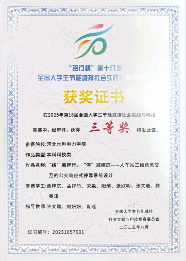 在2025年第18届全国大学生节能减排社会实践与科技竞赛中,我校《“络”启智行,“停”减碳踪——人车站三维信息交互的公交响应式停靠系统设计》项目,在本科科技类赛道脱颖而出,荣获国赛三等奖。